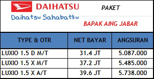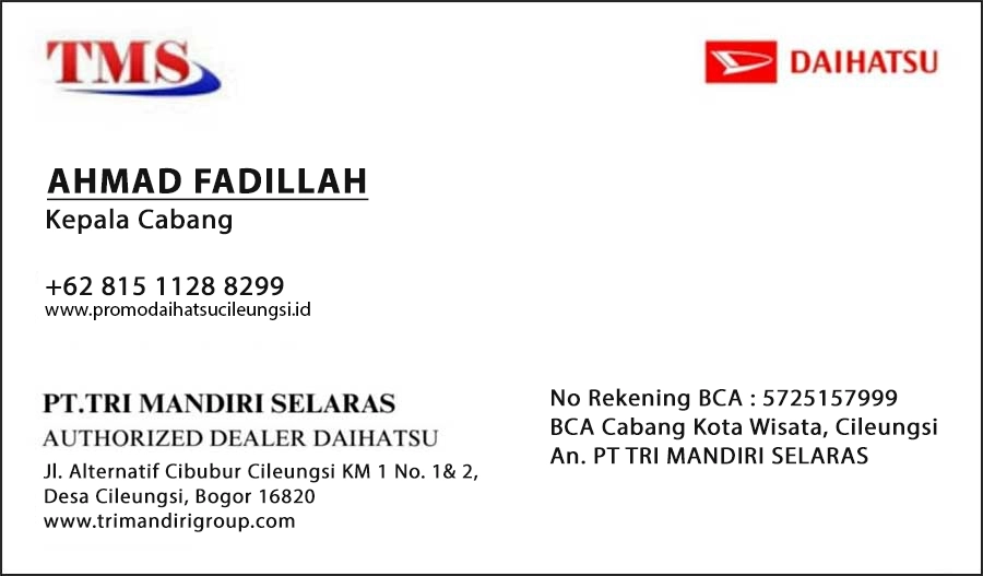 Saya A. FADILLAH Kepala Cabang TMS Daihatsu, Melayani penjualan an perusahaan ( fleet), plat kuning, plat hitam, Sejabodetabek, Kalimantan & Pulau Bangka Belitung untuk Semua Jenis Mobil Daihatsu Seperti Ayla, Sigra, Sirion, Xenia, Rocky, Terios, Luxio, Granmax Minibus, Granmax Pickup. Juga Melayani pembelian perorangan ( retail ).